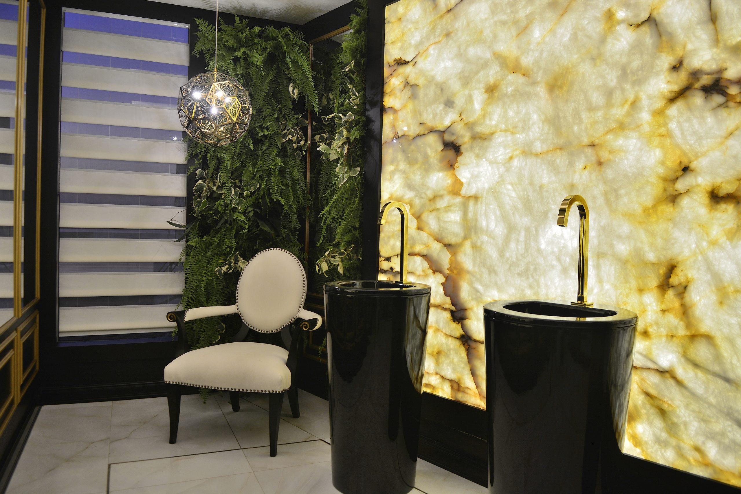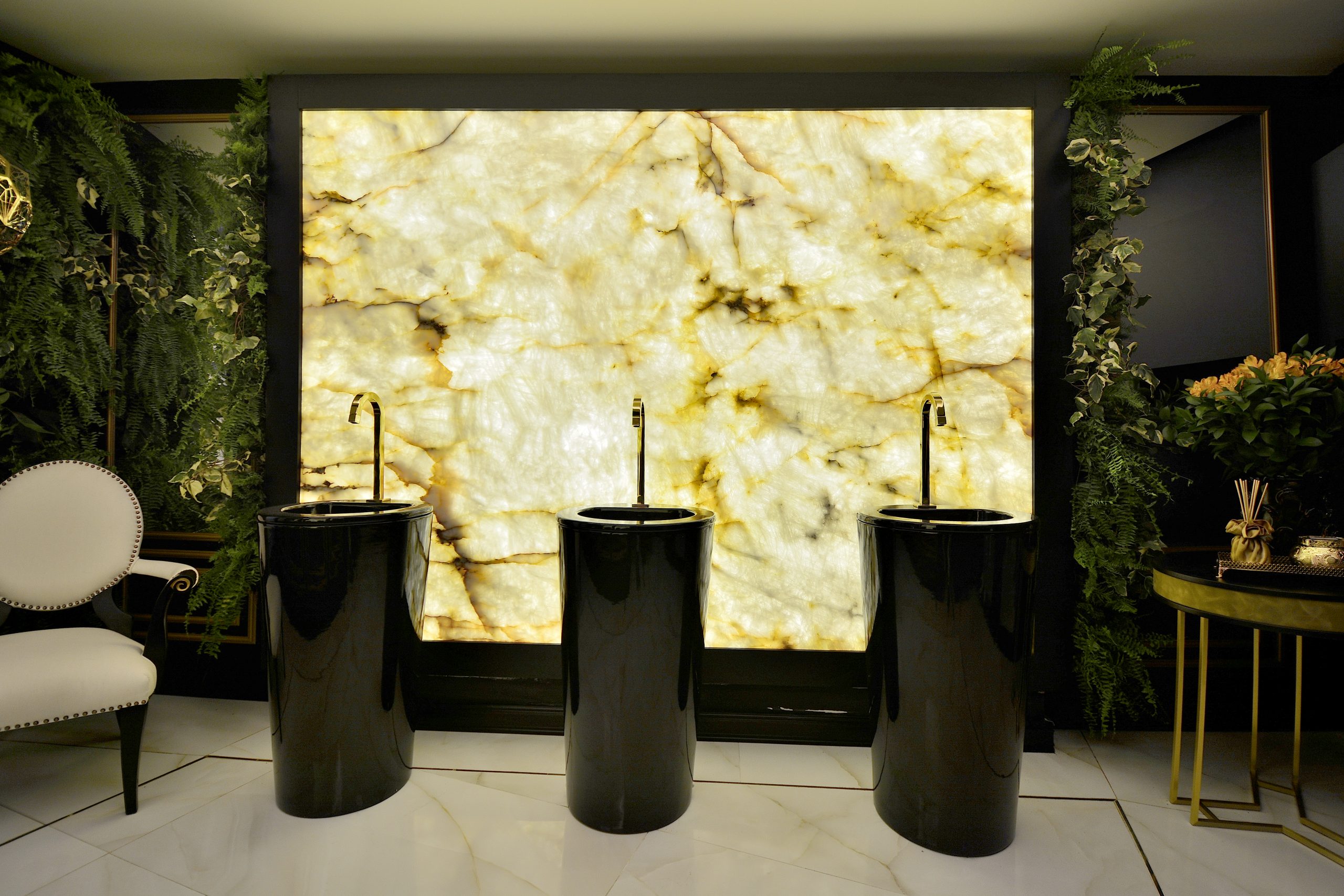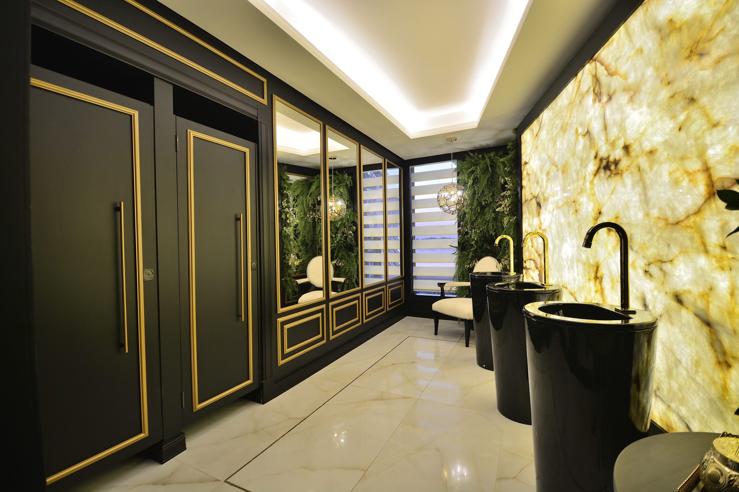 Os lavatórios altos em preto e dourado e o jardim vertical complementaram a composição, que resultou num ambiente elegante e sofisticado.